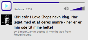 18 May 201118 May 2011Simon Kvamm – Fuck Min Højdeskræk (Loveshop Cover Version) (1984/2011) Scroll down to content Nephew singer Simon Kvamm recorded this version of the 1994 song as an hommage to Danish post-punk rockers Loveshop. [via Simon Kvamm – dedicated to Jens Unmack – in memory of Henrik Hall] Please be social: Click to share on Flattr (Opens in new window) Flattr Click to share on Facebook (Opens in new window) Facebook Click to share on X (Opens in new window) X Click to share on Pinterest (Opens in new window) Pinterest Click to share on Tumblr (Opens in new window) Tumblr Click to share on LinkedIn (Opens in new window) LinkedIn Click to share on Reddit (Opens in new window) Reddit Like Loading... Related Published by Admin View all posts by Admin